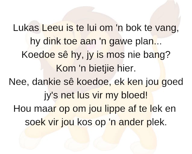 Maak tyd vir storielees vir mekaar, want net soos oefeninge goed is vir die liggaam is lees goed vir die gedagtes en brein. Ons begin reeds van babatyd af vir ons kleingoed stories lees. In die eerste jaar is dit regtig nie so nood-saaklik om die storie te lees nie. Vertel hom/haar wat op die bladsye aan-gaan. Wanneer hy/sy haar vinger na iets wys, gee die inligting: “Dit is die kat. Kyk die kat kruip vir daardie kwaai groot hond onder die tafel weg. Sien jy die hond? Kyk sy kwaai gesig ...” Selfs wanneer hulle kleuters is en nog nie self kan lees nie kan jy soms vir hulle ‘n beurt gee om te “lees”. Laat hy/sy sy/haar verbeelding vrye teuels gee en luister aandagtig na die storie wat hy/ sy vir jou vertel. Moet nie in die beginjare teveel bekommer oor lees nie –maak hom/haar lief vir boeke.